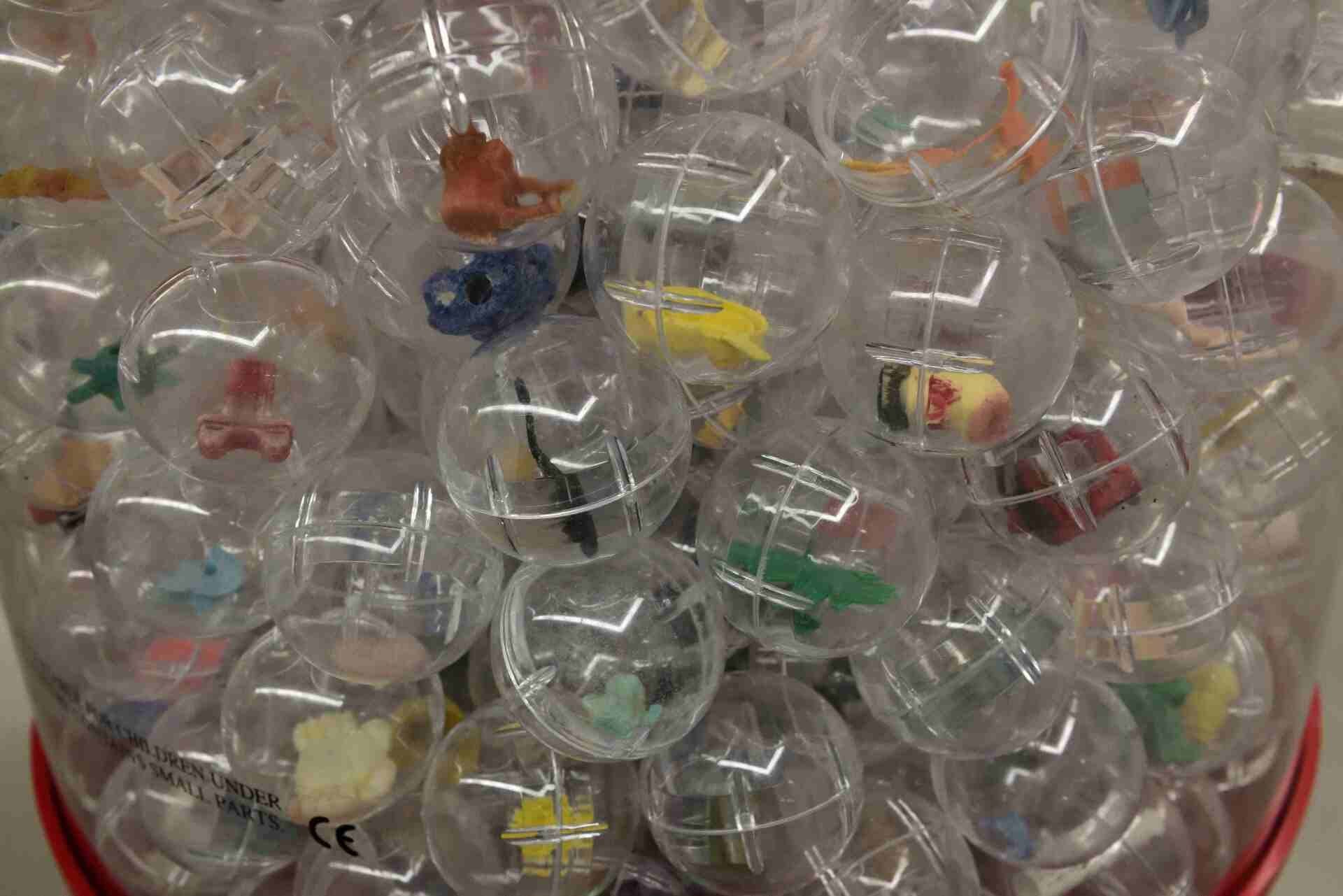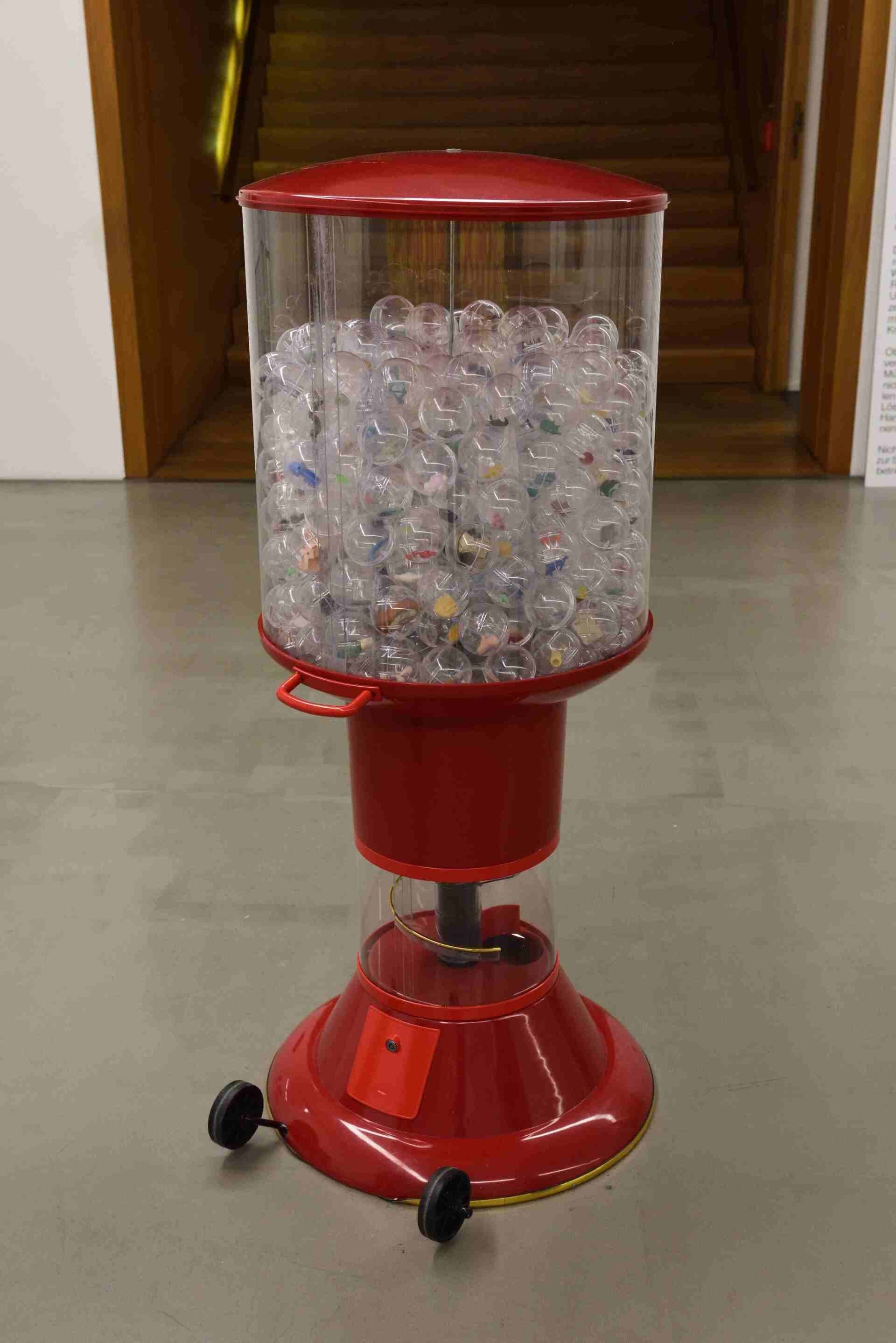 Was wie ein übergroßer Kaugummiautomat aussieht, entpuppt sich beispielsweise als von Swaantje Güntzel gestaltetes Objekt mit Plastikspielzeug und Kunststoffkleinteilen aus im Pazifik verendeten Albatrossen.